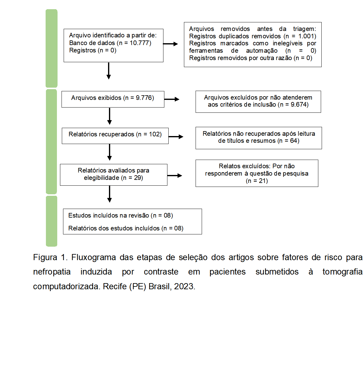 Foram considerados como critérios de elegibilidade: artigos completos publicados de 2019 a 2023, disponíveis nas bases de dados elencadas nos idiomas em português e inglês, como também os que abordassem os fatores de risco para ocorrência de nefropatias induzidas por contraste em pacientes submetidos à tomografia computadorizada. A escolha dos artigos publicados entre o período dos últimos cinco anos (2019 a 2023) visou à busca das evidências recentes sobre o objeto de estudo. Foram excluídos artigos no formato de editoriais, cartas ao editor, resumos, opinião de especialistas, revisões, resenhas, bem como, livros, capítulos de livros, teses, dissertações, monografias e demais formatos de trabalhos de conclusão de curso não publicados no formato de artigo científico.