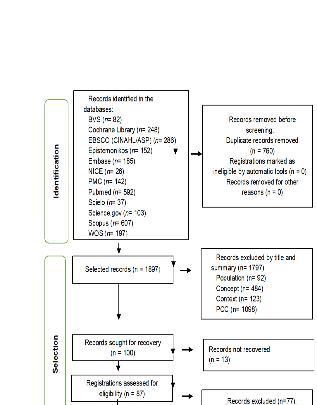 A full secondary search with controlled and non-controlled words, along with the delimiting operators (AND, OR and the NOT operator was not used), was carried out in April 2021, with the search being updated in March 2023 in the following databases: VHL, Cochrane Library, Cumulative Index to Nursing and Allied Health Literature (CINAHL), Epistemonikos, Embase, National Institute for Health and Clinical Excellence, PubMed Central, PubMed, Scientifc electronic library online (Scielo), Science. gov, Scopus and Web of Science (WoS). In the identification stage, the search strategy was defined by relating all the PCC terms according to the search configuration of each database. The search strategies are available in the scoping protocol registered on the Figshare and Open Science Framework platforms. 12-13