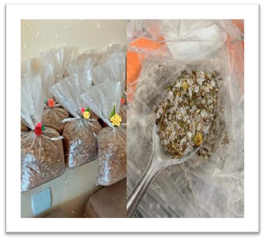 Cada kit continha os seguintes materiais: 2 xícaras de sal marinho; 4 gotas de óleo essencial de lavanda (Lavandula angustifolia) diluído em 30 ml de óleo vegetal semente de uva, adicionada 1 colher de sopa dessa diluição e 1 colher de chá de ervas (camomila e erva-doce) (Figura 1).