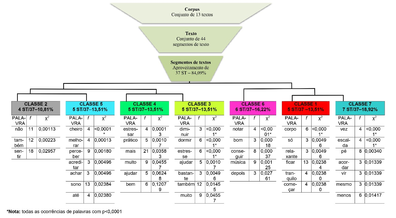 Para melhor compreensão dos resultados, elaborou-se um dendrograma a partir do phylograma fornecido pelo IRAMUTEQ. Destaca-se que esse corpus foi gerado no momento da intervenção após o 12o dia de aplicação da técnica do escalda-pés com as PICS pelos discentes. Constituíram-se 13 conjuntos de textos fragmentados em 36 segmentos, com aproveitamento de 29 segmentos de texto. Para apresentação das classes e listas de palavras, foram analisadas as frequências (f) e ocorrências geradas a partir do teste qui-quadrado (χ2) (Figura 3).