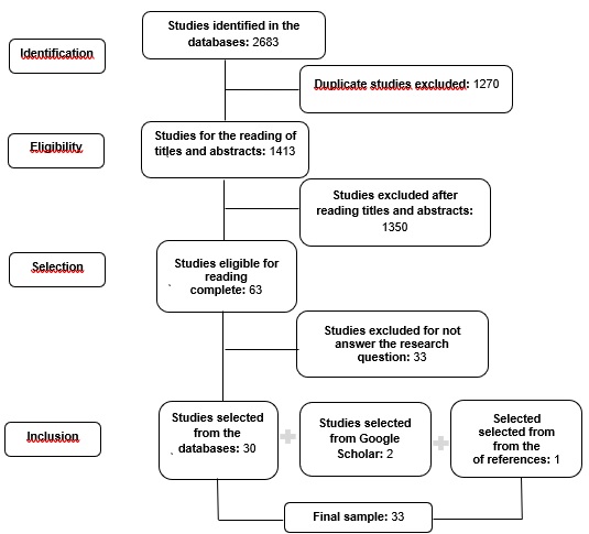 The initial search yielded a sample of 2,683 studies: 834 from MEDLINE via PUBMED, 536 from EMBASE, 801 from Web of Science, 254 from SCOPUS, 140 from CINAHL, and 118 from LILACS. After excluding duplicates and the eligibility criteria, 63 studies were selected for full reading (Figure 1).